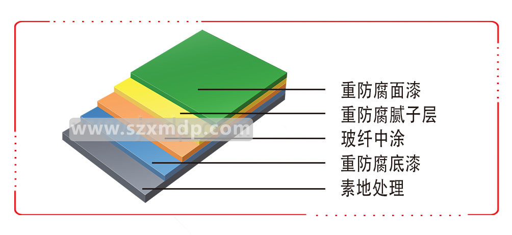 ![]() 素地處理:打磨、吸塵處理: 底 涂:涂刷1-2遍環(huán)氧樹脂強(qiáng)滲透封閉底涂; 砂漿中涂:環(huán)氧樹脂中涂料調(diào)石英砂,用鏝刀或平刀抹刮,根據(jù)厚度要求可以多層施工; 膩 子 層:批刮環(huán)氧樹脂膩?zhàn)訉硬牧希?br style="box-sizing: border-box;"/>面 涂:用鏝刀將環(huán)氧樹脂自流平面漆鏝涂于中涂涂層之上 防 滑 面:滾涂環(huán)氧樹脂面材料,并均勻拋灑石英砂,固化后掃掉浮砂,再罩上面漆 | ![]() ![]() |